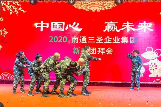 為了弘揚(yáng)體育健身精神,本次年會上凸顯對“體育強(qiáng)則中國強(qiáng)”的高度關(guān)注:曾參加今年“南通國際馬拉松”賽事的三圣健將們,高舉國旗、彩球,插上雙翼、身披戰(zhàn)袍,用自己的特殊方式,威風(fēng)凜凜地依次入場;彩虹跑小組成員也自信亮相,搞怪機(jī)靈的鼠大哥帶著鼠弟鼠妹接過豬師兄的接力棒開啟了2020新大門,合唱合舞燃爆現(xiàn)場。