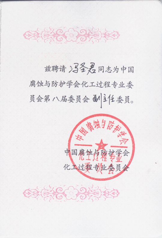 日前,公司馮圣君董事長收到證書,正式出任中國腐蝕與防護學會化工過程專業(yè)委員會第八屆委員會副主任委員。